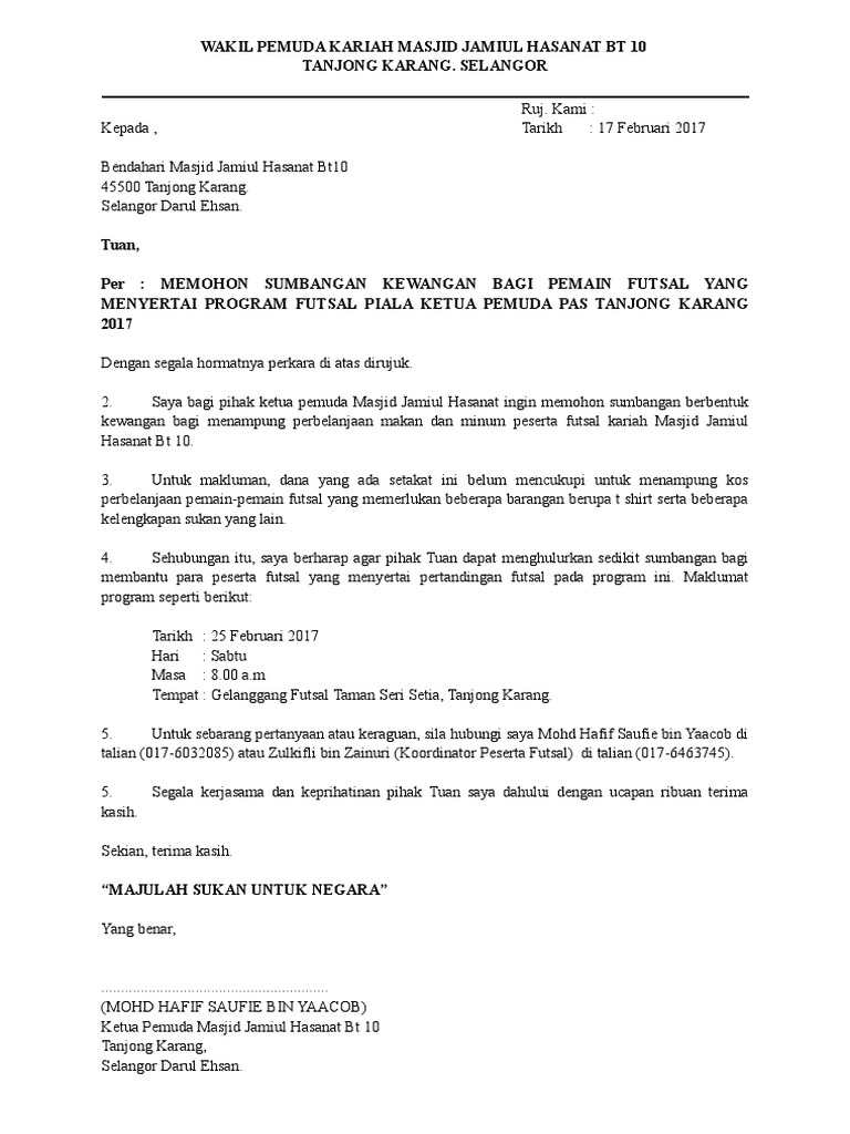 Surat Mohon Sumbangan Kerusi Dan Meja Taman from imgv2-1-f.scribdassets.com Surat permohonan biasanya dipakai oleh seseorang, organisasi, instansi, atau badan usaha untuk mengajukan suatu permohonan secara formal kepada pihak lain. Salah satu faktor yang biasanya sering menjadi kendala adalah masalah yang berkaitan dengan finansial atau. Contoh surat somasi yang benar untuk berbagai kasus sebagai referensi pembuatan surat pemberitahuan yang dapat diunduh secara gratis. Contoh surat somasi terkadang berkaitan dengan pelanggaran perjanjian, perihal penghinaan, hingga hutang surat somasi pelanggaran serah terima. Memohon sumbangan & derma ikhlas pembangunan kompleks tahfiz mutmainnah. Contoh surat somasi untuk persoalan hutang piutang. 8/13/2019 contoh surat memohon sumbangan derma pembangunan surau alfirdaus taman garing utama, rawang, selangor 1/108/13/2019 contoh surat memohon sumbangan derma pembangunan… Contoh surat permohonan untuk izin, kerjasama, barang, dana dan lain sebagainya bisa kami menerima apapun jenis bantuan sumbangan yang akan diberikan baik berupa materi maupun non hasil sumbangan yang telah terkumpul akan segera kami salurkan kepada para warga terdampak.